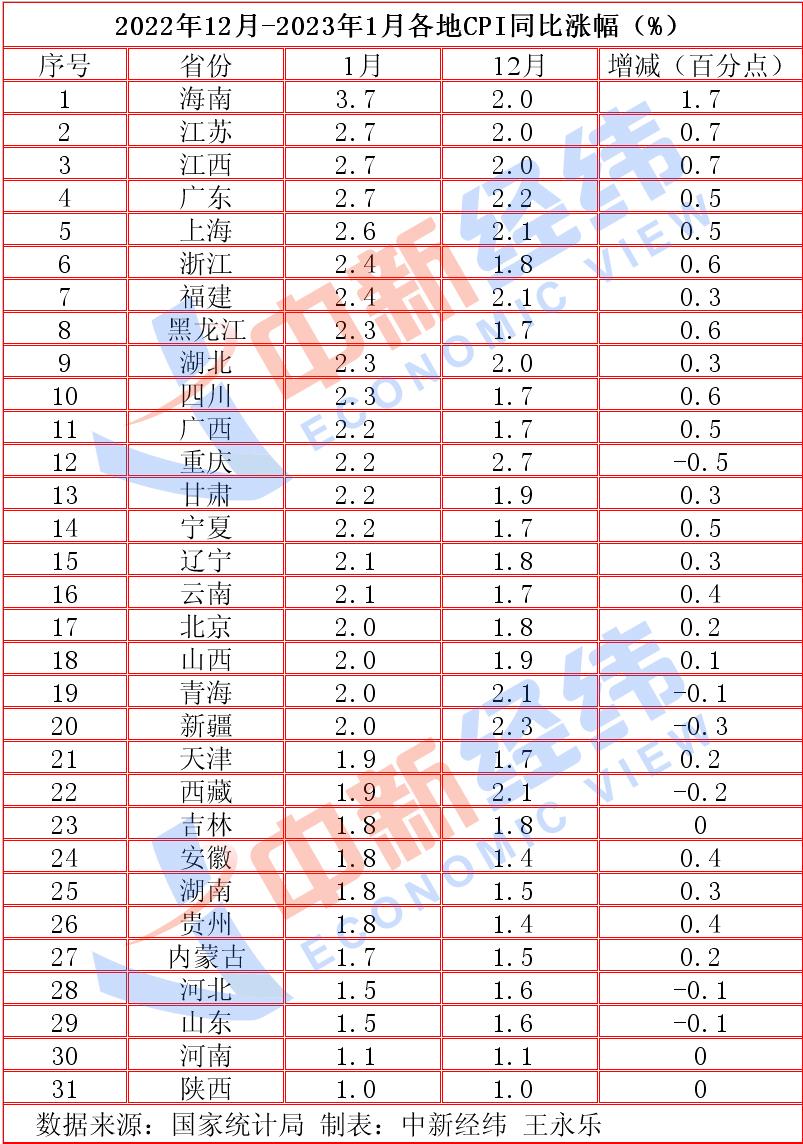(王永乐)日前,国家统计局公布了31省份2023年1月居民消费价格指数(CPI)。中新经纬梳理发现,1月,22省份CPI同比涨幅高于上月。其中,海南最高为涨3.7%,陕西最低涨1.0%。