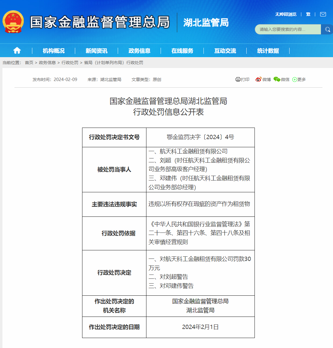 日前,国家金融监管总局湖北监管局(简称:湖北监管局)公布相关处罚信息显示,航天科工金融租赁有限公司(简称:航天科工金租)因违规以所有权存在瑕疵的资产作为租赁物,湖北监管局依据《中华人民共和国银行业监督管理法》第二十一条、第四十六条、第四十八条及相关审慎经营规则,对其处以罚款合计30万元。