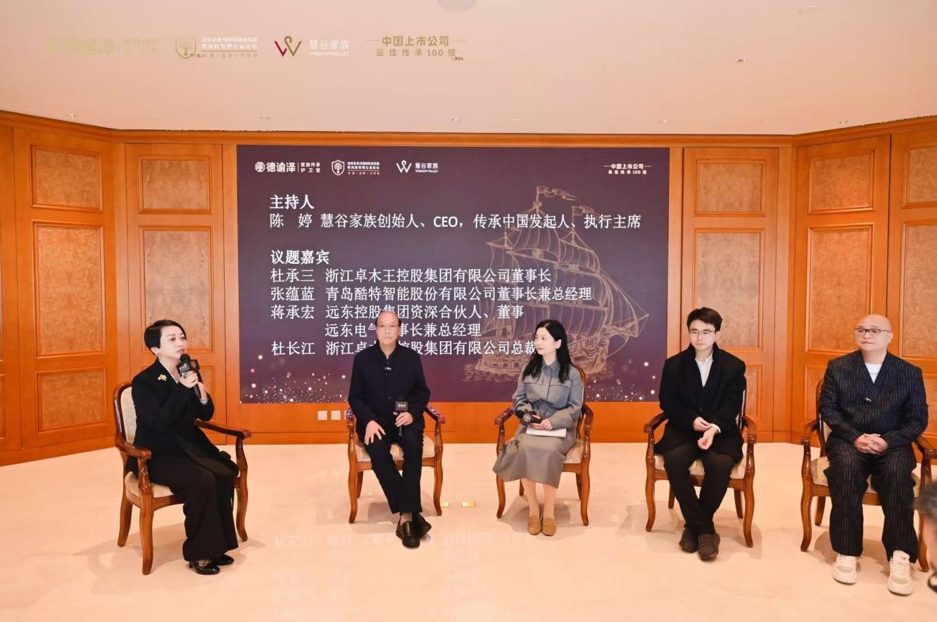 “代际传承的破局之道”论坛由慧谷家族创始人陈婷主持,汇聚了包括浙江卓木王控股集团杜承三、杜长江父子,青岛酷特智能股份有限公司董事长兼总经理张蕴蓝,远东控股集团资深合伙人、董事、远东电气董事长兼总经理蒋承宏等在内的多位跨代际企业家,分享了如何在传承中平衡家庭情感与企业治理的宝贵经验。