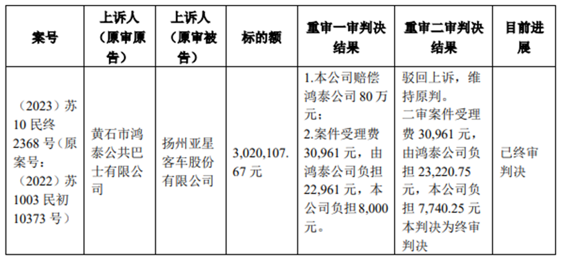 9月15日晚,据亚星客车最新发布的公告称,扬州市中级人民法院重审二审判决结果为驳回上诉,维持原判,本判决为终审判决。