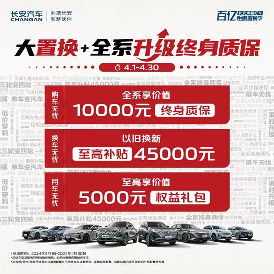 践行“伙伴+”用户思维,百亿钜惠置换季中,用户还可享受至高价值5000元权益礼包,实现用车无忧。此外,长安汽车还于4月1日官宣,截止4月30日,旗下全系车型升级享价值10000元终身质保,让用户买的放心、用的安心。