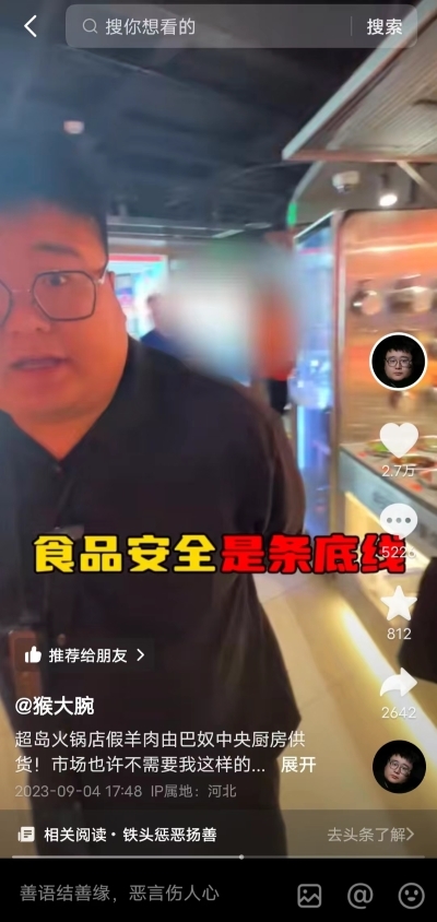 据了解,事件起因系博主“猴大腕”在社交平台上发布系列视频,曝光超岛北京合生汇店卖“假羊肉”一事。具体为,该博主共花费98元在超岛购买了6盒肉类食材,其中4盒高钙羊肉卷被权威机构检测出鸭成分。