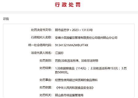 不过,记者关注到,要以口碑取胜的小菜园近年来也被曝出过食品安全方面的问题。据2023年9月北京市房山区市场监督管理局发布的餐饮业食品安全大检查处置公告,北京小菜园餐饮房山分公司因存在经营标注虚假生产日期、保质期或者超过保质期的食品的行为,被处罚款5万元,并暂停线上经营行为。2023年6月,安徽小菜园餐饮宿州砀山分公司也因使用过保质期的食品原料被罚款5000元。