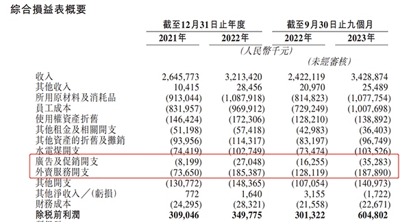 除广告费用,小菜园还有外卖服务开支,包括佣金及配送费用等,相比之下这方面费用才是大头。截至2021年、2022年以及2023年前9个月,小菜园的外卖服务开支分别为0.74亿元、1.85亿元、1.88亿元,占各期间收入的2.8%、5.8%及5.5%。