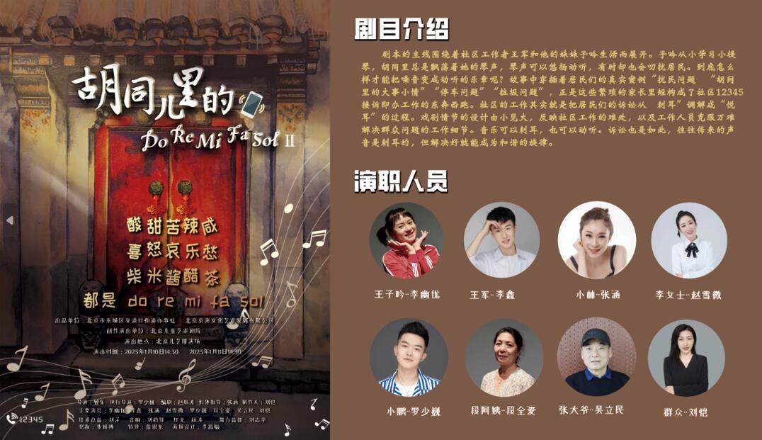 为助力东城区加速“崇文争先”,进一步推动“文化东城”建设,深化“大戏东望”文化品牌,由北京京演文化艺术发展有限公司、东城区人民政府交道口街道办事处联合出品,北京儿童艺术剧院股份有限公司策划制作的原创话剧《胡同儿里的Do Re Mi Fa Sol》Ⅱ于1月10日、11日14:30在北京儿童艺术剧院剧场精彩上演。该剧聚焦“12345政务服务便民热线”,通过话剧的艺术表现形式讲述、演绎百姓的身边事,跌宕起伏的故事情节和演员们酣畅淋漓的舞台表现赢得了现场观众的阵阵掌声。