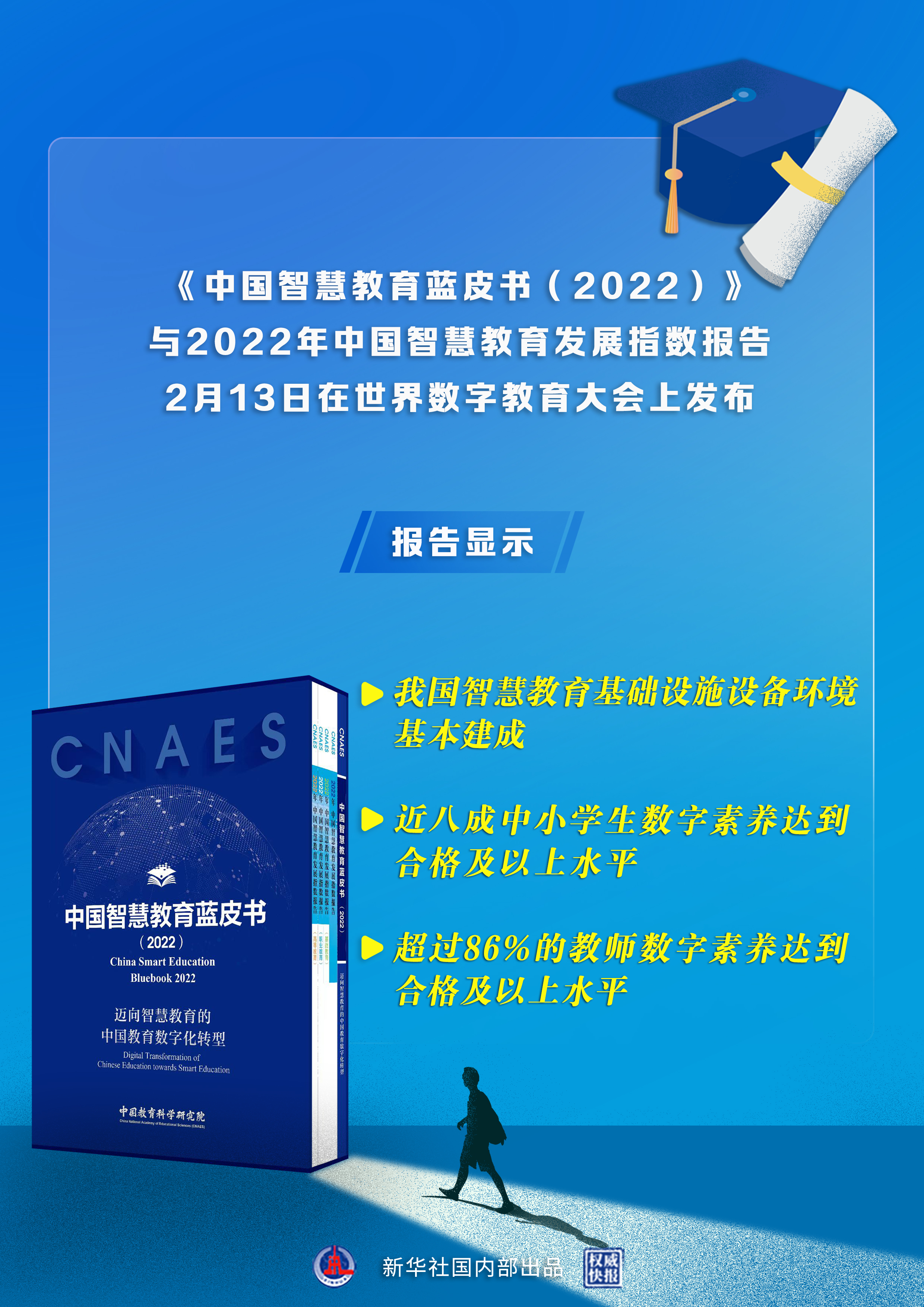 2月13日,在教育部与中国联合国教科文组织全国委员会举办的世界数字教育大会上,《中国智慧教育蓝皮书(2022)》与2022年中国智慧教育发展指数报告发布。