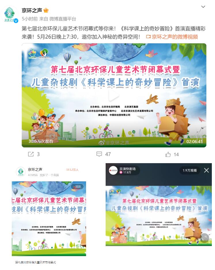 由北京市生态环境局、北京演艺集团主办,北京市生态环境保护宣传中心、北京京演文化艺术发展有限公司联合承办的第七届北京环保儿童艺术节,于2023年5月26日在中国木偶艺术剧院圆满收官。现场600余名观众观看了由中国杂技团精心编排的儿童杂技剧《科学课上的奇妙冒险》首场演出活动,同时通过“京环之声”一直播、“京环之声”微博平台、北京演艺集团“京演快剧场”官方快手号进行同步直播,吸引了345.7万余人次在线观看。