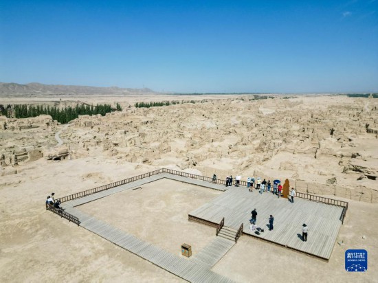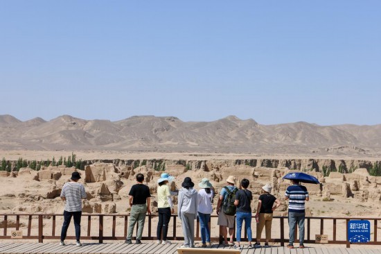 游客在位于吐鲁番市的交河故城景区参观(6月25日摄)。