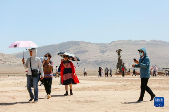 游客在位于吐鲁番市的火焰山景区游览(6月27日摄)。