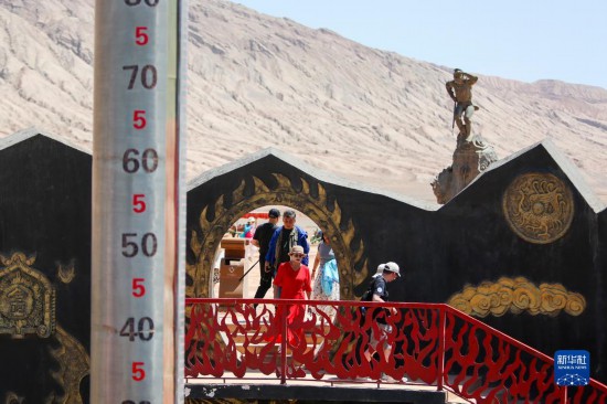 游客在位于吐鲁番市的火焰山景区游玩(6月27日摄)。巨型温度计显示当时火焰山景区地表温度约为65摄氏度。