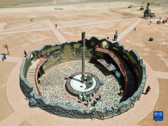 游客在位于吐鲁番市的火焰山景区游玩(6月27日摄,无人机照片)。巨型温度计显示当时火焰山景区地表温度约为65摄氏度。