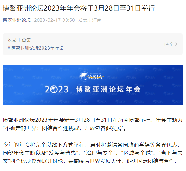 博鳌亚洲论坛2023年年会将于3月28日至31日举行